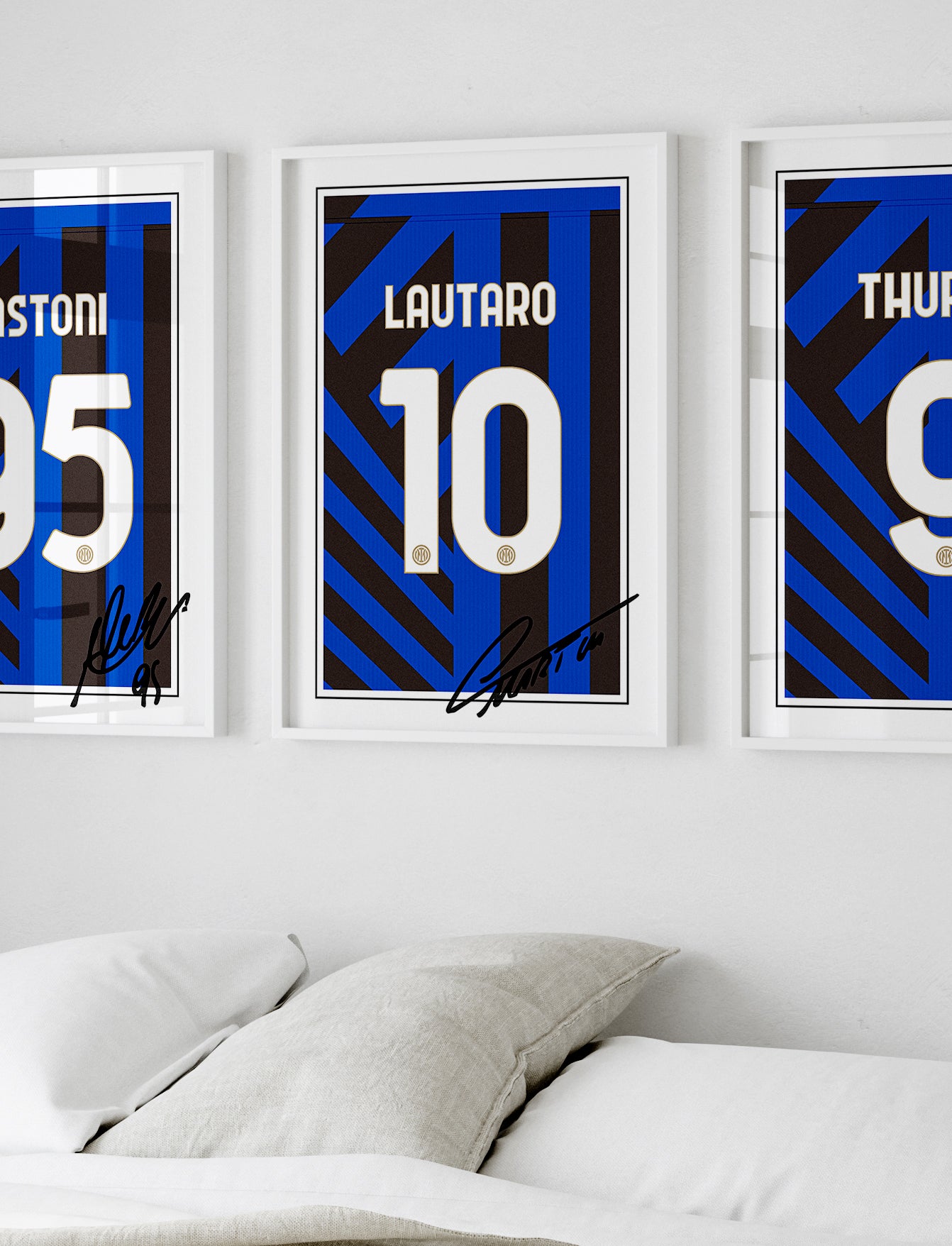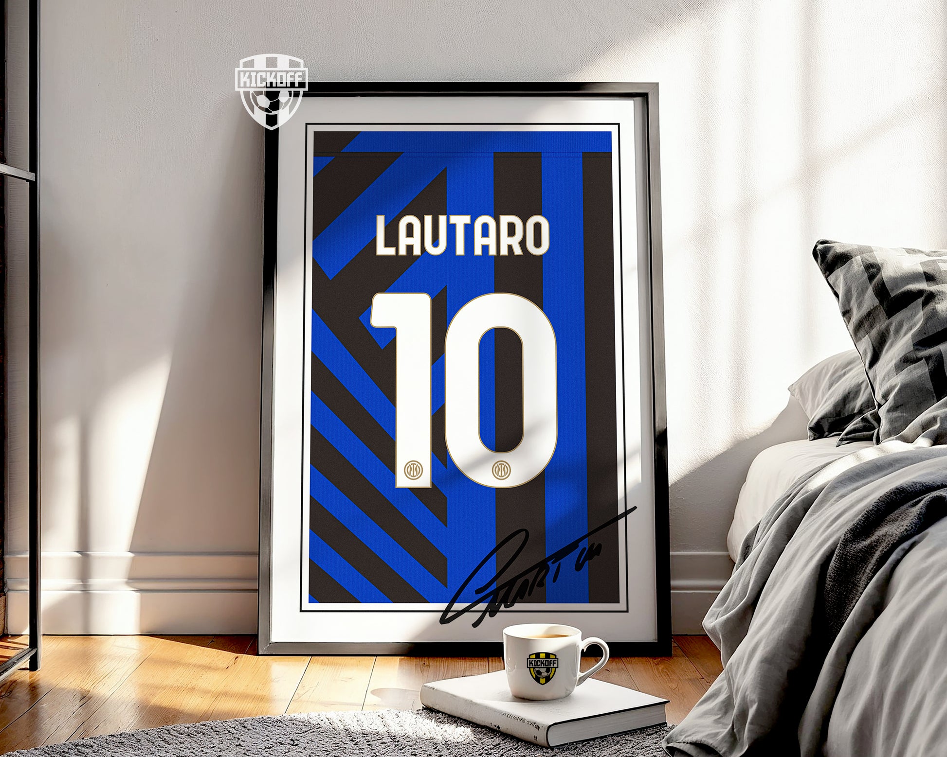 Elevate your space and celebrate the beautiful game with our Lautaro Martinez 24/25 Home Shirt Poster featuring the Inter Milan #10 with printed signature.