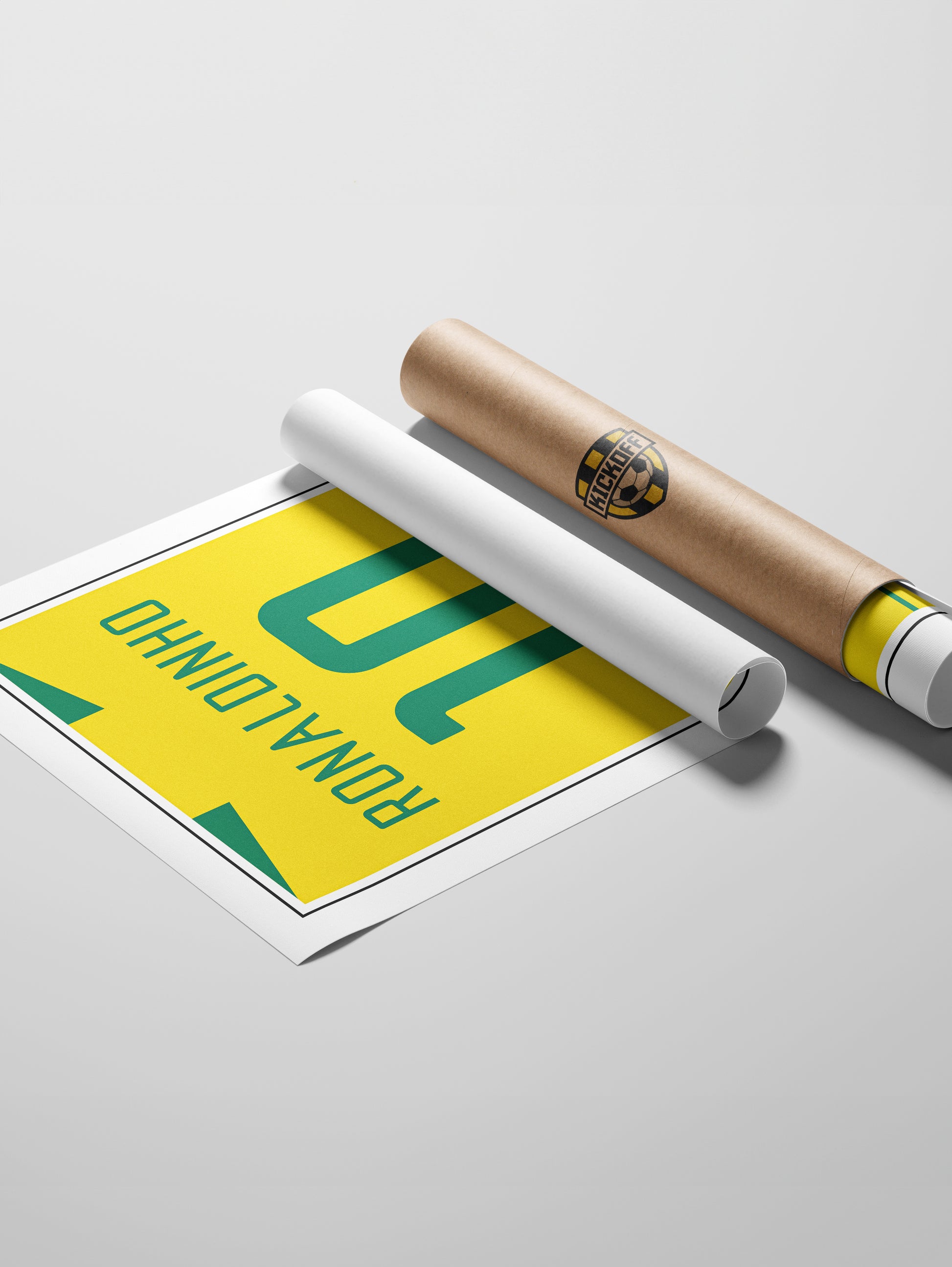 Elevate your space and celebrate the beautiful game with our Ronaldinho 2002 World Cup Shirt Poster featuring the Brazilian #10 with printed signature.