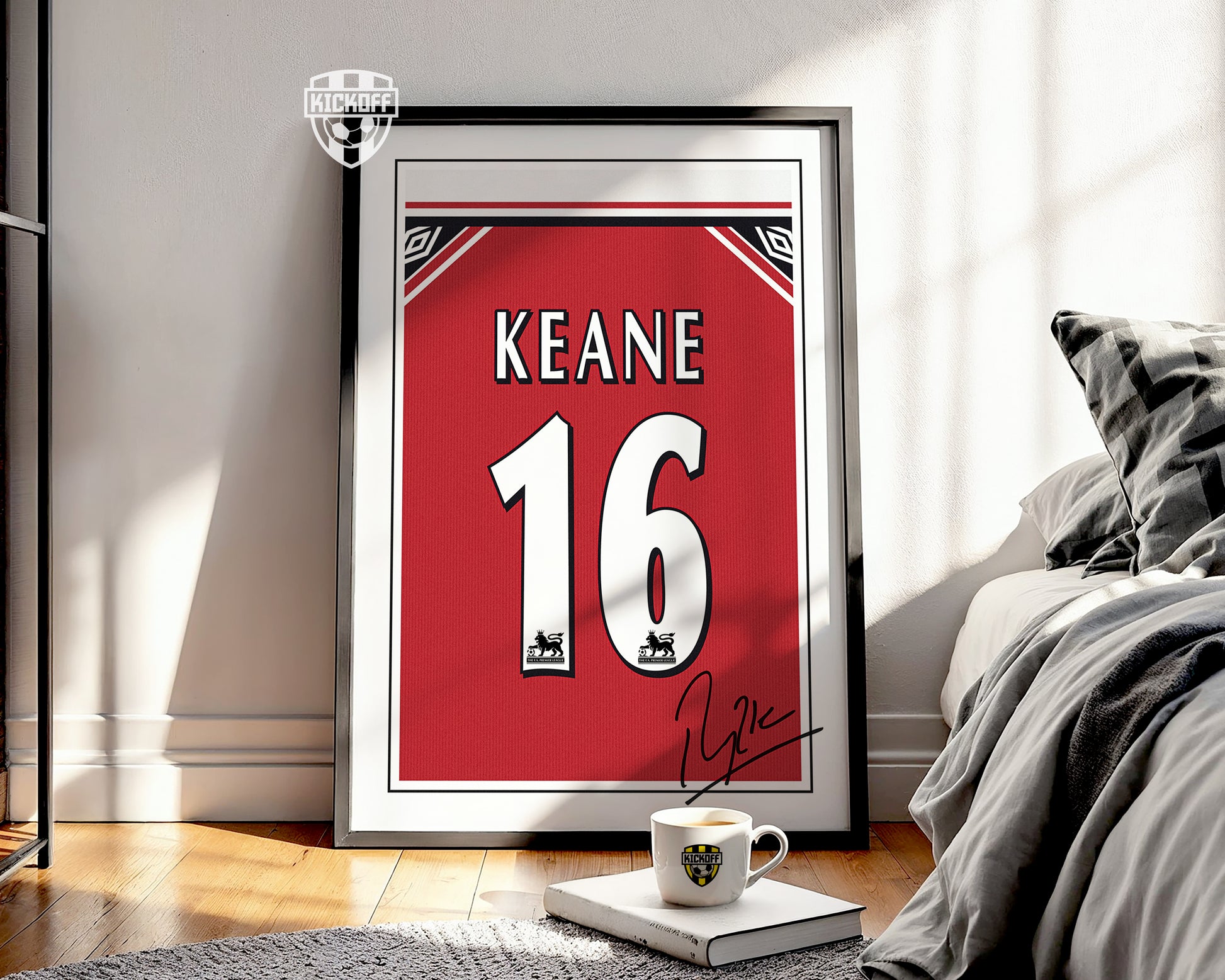 Elevate your space and celebrate the beautiful game with our Roy Keane 98/99 Classic Home Shirt Poster featuring the Manchester United #16 with printed signature.